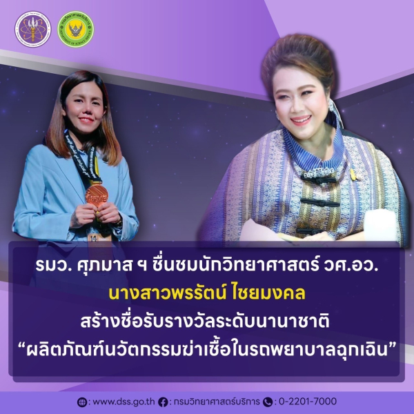 โดยผลงานล่าสุด กรมวิทยาศาสตร์บริการ (วศ.) กระทรวง อว. ได้ส่งนางสาวพรรัตน์ ไชยมงคล นักวิทยาศาสตร์ เข้าร่วมประกวดผลงานนวัตกรรมในงาน International Exhibition of Inventions in the Middle East ณ ประเทศคูเวต ซึ่งจัดโดย Kuwait Science Club ในพระอุปถัมภ์ของเจ้าผู้ครองรัฐคูเวต โดยนำผลงาน “นวัตกรรมผลิตภัณฑ์ด้านการทำความสะอาดฆ่าเชื้อในรถบริการการแพทย์ฉุกเฉิน“ โดยการใช้กระบวนการ Advanced Oxidation Process ในการฆ่าเชื้อโรคทั้งในพื้นผิวและอากาศภายในรถบริการการแพทย์ฉุกเฉิน” เป็นผลงานการวิจัยและพัฒนาร่วมกับจุฬาลงกรณ์มหาวิทยาลัย สถาบันการแพทย์ฉุกเฉินแห่งชาติ และศูนย์ความเป็นเลิศด้านชีววิทยาศาสตร์ ซึ่งเป็นตัวแทนจากประเทศไทยเข้าประกวดและได้รับรางวัลระดับนานาชาติในครั้งนี้ นับเป็นที่น่ายินดีและนำมาซึ่งความภาคภูมิใจอย่างยิ่งสำหรับบุคลากรกระทรวง อว. ที่เรามีนักวิทยาศาสตร์รุ่นใหม่ทั้งเก่งและมีความรู้ความสามารถสร้างชื่อเสียงให้แก่ประเทศชาติได้ ภายในงานฯ ดังกล่าว ได้รับเกียรติจากเอกอัครราชทูตฯ ณ คูเวต ร่วมแสดงความยินดีและพูดคุยกับทีมนวัตกรเกี่ยวกับโอกาสทำความร่วมมือด้านนวัตกรรมและธุรกิจที่เกี่ยวข้องระหว่างไทยกับคูเวต พร้อมทั้งเชิญชวนทีมวิจัย วศ.อว.เข้าร่วมโครงการฯ ของสถานเอกอัครราชทูตฯ เพื่อขยายเศรษฐสัมพันธ์และความร่วมมือทางวิชาการในอนาคต