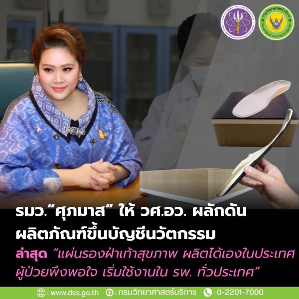 รมว. “ศุภมาส” ให้ วศ.อว. ผลักดันผลิตภัณฑ์ขึ้นบัญชีนวัตกรรม ล่าสุด “แผ่นรองฝ่าเท้าสุขภาพ ผลิตได้เองในประเทศ ผู้ป่วยพึงพอใจ เริ่มใช้งานใน รพ. ทั่วประเทศ”