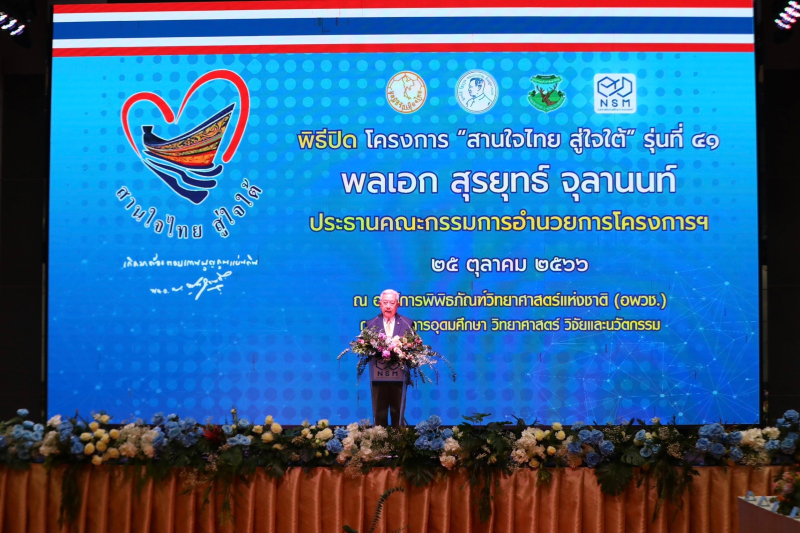 เมื่อวันที่ 25 ต.ค. พลเอก สุรยุทธ์ จุลานนท์ ประธานองคมนตรี และประธานคณะกรรมการอำนวยการโครงการ “สานใจไทย สู่ใจใต้“ เป็นประธานในพิธีปิดโครงการ "สานใจไทย สู่ใจใต้" รุ่นที่ 41 โดยมี นายอารีย์ วงศ์อารยะ รองประธานคณะกรรมการอำนวยการโครงการฯ แพทย์หญิงเพชรดาว โต๊ะมีนา ที่ปรึกษารัฐมนตรีว่าการกระทรวงการอุดมศึกษา วิทยาศาสตร์ วิจัยและนวัตกรรม (อว.) นางสาวสุณีย์ เลิศเพียรธรรม หัวหน้าผู้ตรวจราชการกระทรวง อว. และ ผศ.ดร.รวิน ระวิวงศ์ ผู้อำนวยการองค์การพิพิธภัณฑ์วิทยาศาสตร์แห่งชาติ (อพวช.) เข้าร่วม ณ ห้องแสงเดือน อาคารพิพิธภัณฑ์พระรามเก้า อพวช. คลองห้า จังหวัดปทุมธานี โดยมีเยาวชนจาก 5 จังหวัดชายแดนภาคใต้เข้าร่วมโครงการฯ จำนวน 320 คน ระหว่างวันที่ 27 ก.ย. - 27 ต.ค. 2566