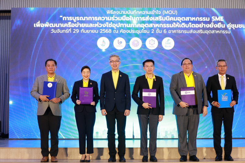 เมื่อวันที่ 29 ก.ย. ศ.ดร.ศุภชัย ปทุมนากุล ปลัดกระทรวงการอุดมศึกษา วิทยาศาสตร์ วิจัยและนวัตกรรม (อว.) ร่วมลงนามบันทึกความเข้าใจ “การบูรณาการความร่วมมือในการส่งเสริมนิคมอุตสาหกรรม SME เพื่อพัฒนาเครือข่ายและห่วงโซ่อุปทานภาคอุตสาหกรรมให้เติบโตอย่างยั่งยืน คู่ชุมชน” มุ่งจัดสรรพื้นที่รองรับผู้ประกอบการ และสนับสนุนการย้ายถิ่นฐานหรือขยายการผลิตเข้าสู่พื้นที่นิคมฯ ให้ได้รับการดูแลอย่างเป็นระบบ พร้อมวางแผนต่อยอดด้านเทคโนโลยี นวัตกรรม และเครือข่ายธุรกิจในอนาคต โดยผู้ร่วมลงนามประกอบไปด้วย นางสาวณัฏฐิญา เนตยสุภา อธิบดีกรมส่งเสริมอุตสาหกรรม (กสอ.) นายพรยศ กลั่นกรอง อธิบดีกรมโรงงานอุตสาหกรรม (กรอ.) นายสุเมธ ตั้งประเสริฐ ผู้ว่าการการนิคมอุตสาหกรรมแห่งประเทศไทย (กนอ.) และนายพิชิต มิทราวงศ์ กรรมการผู้จัดการ ธนาคารพัฒนาวิสาหกิจขนาดกลางและขนาดย่อมแห่งประเทศไทย (ธพว.) และมีนายณัฐพล รังสิตพล ปลัดกระทรวงอุตสาหกรรม เป็นสักขีพยาน ณ ห้องประชุมโซน 2 ชั้น 6 อาคารกรมส่งเสริมอุตสาหกรรม