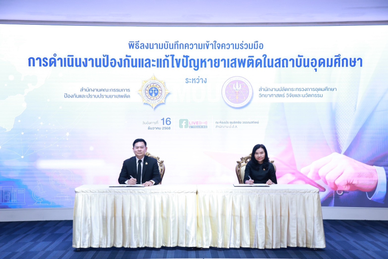 เมื่อวันที่ 16 ธ.ค. นางสาววราภรณ์ รุ่งตระการ รองปลัดกระทรวงการอุดมศึกษา วิทยาศาสตร์ วิจัยและนวัตกรรม (อว.) และพันตำรวจตรี สุริยา สิงหกมล เลขาธิการสำนักพัฒนาการป้องกันและแก้ไขปัญหายาเสพติด (ป.ป.ส.) ลงนามบันทึกความเข้าใจความร่วมมือการดำเนินงานป้องกันและแก้ไขปัญหายาเสพติดในสถาบันอุดมศึกษา ระหว่าง ป.ป.ส. และสำนักงานปลัดกระทรวง อว. โดยมี นางสาวอารีภักดิ์ เงินบำรุง รองเลขาธิการ ป.ป.ส. ร่วมกับผู้แทนจากสำนักงานปลัดกระทรวง อว. ผู้แทนที่ประชุมอธิการบดีแห่งประเทศไทย ผู้แทนที่ประชุมอธิการบดีมหาวิทยาลัยราชภัฏ ผู้แทนที่ประชุมอธิการบดีมหาวิทยาลัยเทคโนโลยีราชมงคล และผู้แทนสมาคมสถาบันอุดมศึกษาเอกชนแห่งประเทศไทย ร่วมเป็นสักขีพยาน ณ ห้องประชุมชิดชัย วรรณสถิตย์ อาคาร 2 ชั้น 3 สำนักงาน ป.ป.ส.