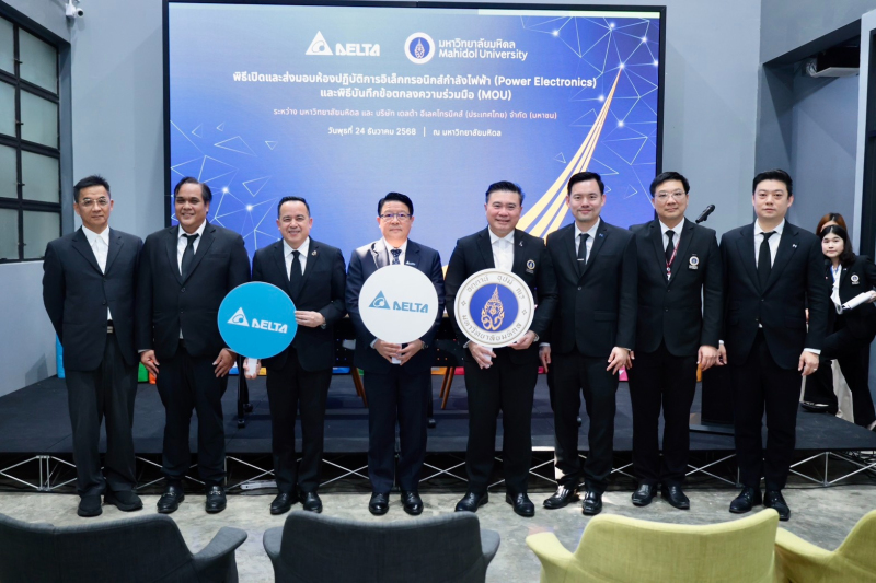 เมื่อวันที่ 24 ธันวาคม ดร.พันธุ์เพิ่มศักดิ์ อารุณี รักษาราชการแทนรองปลัดกระทรวงการอุดมศึกษา วิทยาศาสตร์ วิจัยและนวัตกรรม (อว.) ร่วมแสดงความยินดีในพิธีมอบห้องปฏิบัติการทางวิศวกรรมอิเล็กทรอนิกส์กำลังไฟฟ้า (Power Electronics Laboratory) และพิธีลงนามบันทึกความเข้าใจ (MOU) ระหว่างมหาวิทยาลัยมหิดล และบริษัท เดลต้า อีเลคโทรนิคส์ (ประเทศไทย) จำกัด (มหาชน) โดยมี นายวิคเตอร์ เจิ้ง ประธานเจ้าหน้าที่บริหาร บริษัท เดลต้า อีเลคโทรนิคส์ (ประเทศไทย) จำกัด (มหาชน) รศ.ดร.สิทธิวัฒน์ เลิศศิริ รองอธิการบดีมหาวิทยาลัยมหิดล รศ.ดร.ธนภัทร์ วานิชานนท์ คณบดีคณะวิศวกรรมศาสตร์ มหาวิทยาลัยมหิดล นายสุทธิเกตติ์ ทัดพิทักษ์กุล ดำรงตำแหน่ง รองเลขาธิการคณะกรรมการส่งเสริมการลงทุน (BOI) ผู้บริหาร คณาจารย์ และผู้สนใจเข้าร่วมงาน ณ MaSHARES Co-Working Space @MB มหาวิทยาลัยมหิดล ศาลายา