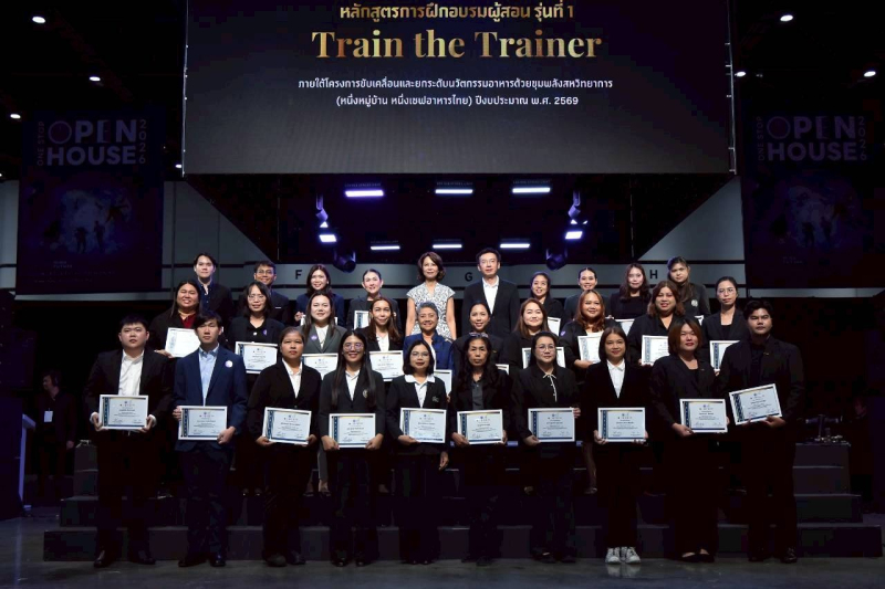 เมื่อวันที่ 8 มีนาคม 2569 ศ.ดร.ศุภชัย ปทุมนากุล ปลัดกระทรวงการอุดมศึกษา วิทยาศาสตร์ วิจัยและนวัตกรรม (อว.) เป็นประธานในพิธีมอบใบประกาศนียบัตรผู้ผ่านหลักสูตร “การฝึกอบรมครูผู้สอน (Train the Trainer)” รุ่นที่ 1 ภายใต้โครงการขับเคลื่อนและยกระดับนวัตกรรมอาหารด้วยขุมพลังสหวิทยาการ “หนึ่งหมู่บ้าน หนึ่งเชฟอาหารไทย” ประจำปี 2569 โดย อว. ร่วมกับ สถาบันอาหาร มุ่งสร้าง “ครูต้นแบบ” 104 คน จาก 25 สถาบันการศึกษา เตรียมพร้อมลงพื้นที่ถ่ายทอดความรู้ ปั้นเชฟนวัตกรรมรุ่นใหม่ 2,500 คนทั่วประเทศ โดยมีนางสาววราภรณ์ รุ่งตระการ รองปลัด อว. นางสาวไปยดา หาญชัยสุขสกุล ผู้อำนวยการสถาบันอาหาร และคณะผู้บริหารหน่วยงาน/สถาบันอุดมศึกษา เข้าร่วม ในงาน One Stop Open House 2026 ณ ศูนย์การประชุมแห่งชาติสิริกิติ์