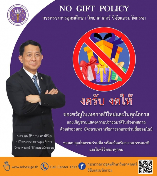 สำนักงานปลัดกระทรวงการอุดมศึกษา วิทยาศาสตร์ วิจัยและนวัตกรรม มีนโยบายขอความร่วมมือ "งดรับ งดให้ของขวัญในเทศกาลปีใหม่และในทุกโอกาส" (No Gift Policy)