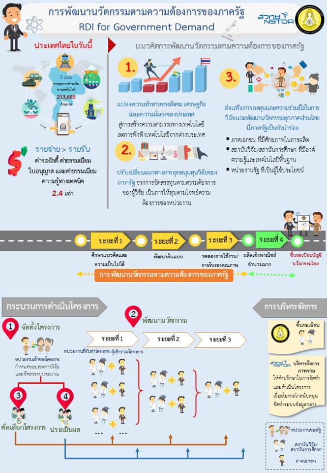 การพัฒนานวัตกรรมตามความต้องการของภาครัฐ คือแนวทางใหม่ในการแก้ปัญหาที่เป็นความท้าทาย ของหน่วยงานภาครัฐทั้งในด้านเศรษฐกิจ สังคม และความมั่นคง ซึ่งผลิตภัณฑ์/บริการ หรือ Solution ที่ ต้องการใช้นั้น อาจยังไม่มีจําหน่ายหรือให้บริการในประเทศ หรือยังไม่สามารถระบุคุณสมบัติได้ อีกทั้งยังต้อง อาศัยการวิจัยและพัฒนาอีกระยะหนึ่ง แนวคิดนี้เรียกอีกอย่างว่า Research Procurement หรือ RDI for Government Demand