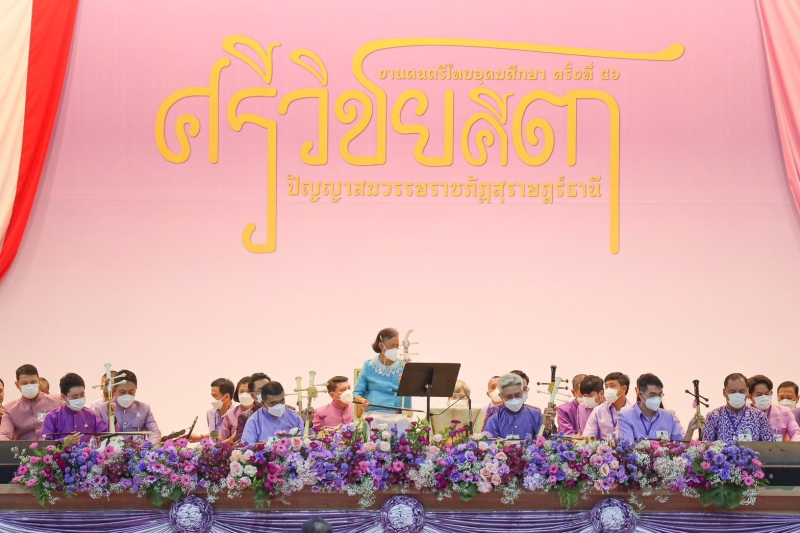 สมเด็จพระกนิษฐาธิราชเจ้า กรมสมเด็จพระเทพรัตนราชสุดาฯ สยามบรมราชกุมารี ทอดพระเนตรและทรงซอด้วงร่วมกับนิสิต นักศึกษา ทรงบรรเลงเพลงชื่นชุมนุมกลุ่มดนตรี เพลงโหมโรงไอยเรศ และเพลงกรมหลวงนราธิวาสราชนครินทร์ และพระราชทานพระราชดำรัสแก่นักดนตรีไทยและผู้ร่วมงานดนตรีไทยอุดมศึกษา ครั้งที่ 46 “ศรีวิชยคีตา ปัญญาสมวรรษราชภัฏสุราษฎร์ธานี” มีสถาบันอุดมศึกษาเข้าร่วมงาน จำนวน 64 สถาบัน มีนิสิต นักศึกษา รวมทั้งครูดนตรีไทยเข้าร่วมงาน กว่า 1,300 คน ร่วมแลกเปลี่ยนเรียนรู้ สร้างประสบการณ์ มุ่งส่งเสริม สร้างความตระหนักคุณค่าของดนตรีไทยมรดกวัฒนธรรมชาติที่สืบทอดมาช้านาน ซึ่งในโอกาสนี้มี ศาสตราจารย์ สิริฤกษ์ ทรงศิวิไล ปลัดกระทรวงอุดมศึกษา วิทยาศาสตร์ วิจัยและนวัตกรรม (อว.) พร้อมด้วย ผู้ช่วยศาสตราจารย์ ดร.วัฒนา รัตนพรหม รักษาราชการแทนอธิการ มหาวิทยาลัยราชภัฏสุราษฎร์ธานี (มรส.) กล่าวคำกราบบังคมทูล เมื่อวันที่ 24 กรกฎาคม 2566 ณ หอประชุมวชิราลงกรณ มหาวิทยาลัยราชภัฏสุราษฎร์ธานี