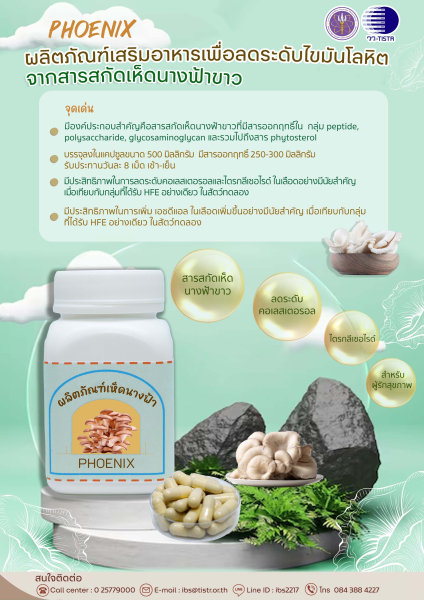 กระทรวงการอุดมศึกษา วิทยาศาสตร์ วิจัยและนวัตกรรม (อว.) โดย ศูนย์เชี่ยวชาญนวัตกรรมผลิตภัณฑ์สมุนไพร สถาบันวิจัยวิทยาศาสตร์และเทคโนโลยีแห่งประเทศไทย (วว.) ร่วมสนับสนุนส่งเสริมการเลือกบริโภคผลิตภัณฑ์เสริมอาหารที่มีส่วนผสมจากธรรมชาติ โดยการใช้ประโยชน์จาก “สารสกัดเห็ดนางฟ้าขาว” ซึ่งมีคุณสมบัติในการลดระดับไขมันในเลือด สู่การพัฒนาเป็น “ผลิตภัณฑ์เสริมอาหาร” เพื่อสร้างทางเลือกให้กับผู้บริโภคในการใช้ร่วมกับการรักษาด้วยยาแผนปัจจุบัน นับเป็นการเพิ่มมูลค่าให้กับอุตสาหกรรมและเศรษฐกิจของประเทศ ในการพัฒนาการผลิตและการส่งออกผลิตภัณฑ์เพื่อสุขภาพจากเห็ดด้วยวิทยาศาสตร์ เทคโนโลยีและนวัตกรรม