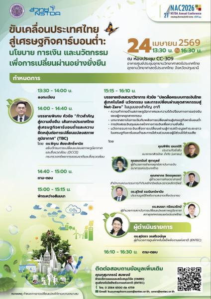 กระทรวงการอุดมศึกษา วิทยาศาสตร์ วิจัยและนวัตกรรม (อว.) โดย สำนักงานพัฒนาวิทยาศาสตร์และเทคโนโลยีแห่งชาติ (สวทช.) ชวนผู้สนใจ มาร่วมเปลี่ยนวิกฤตกติกาโลกให้เป็นโอกาสของธุรกิจในสัมมนา NAC2026 !  "ขับเคลื่อนประเทศไทยสู่เศรษฐกิจคาร์บอนต่ำ: นโยบายการเงินและนวัตกรรมเพื่อการเปลี่ยนผ่านอย่างยั่งยืน" ภายในงานสัมมนานี้ สวทช. ชวนหน่วยงานระดับประเทศ อาทิ กรมการเปลี่ยนแปลงสภาพภูมิอากาศฯ, ธนาคารแห่งประเทศไทย, ก.ล.ต., สภาอุตสาหกรรมฯ ร่วมเจาะลึกนโยบายรัฐที่ภาคธุรกิจต้องรู้เพื่อปรับตัวสู่ Net-Zero พร้อมรับมือวิกฤตโลก พบกันวันที่  24 เม.ย. 2569 เวลา13.30-16.30 น. ณ อุทยานวิทยาศาสตร์ประเทศไทย จ.ปทุมธานี สำรองที่นั่งล่วงหน้า ลงทะเบียนร่วมงานฟรี ได้ที่ https://www.nstda.or.th/nac/2026/seminar/nac-01/