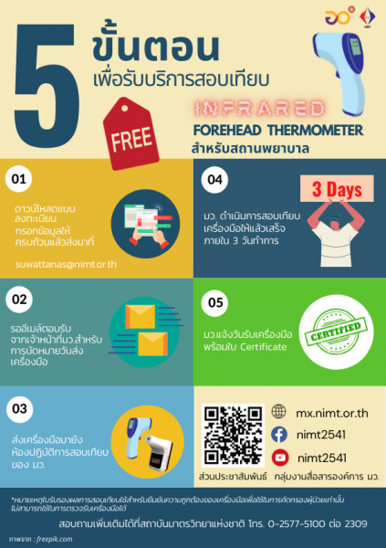 สถาบันมาตรวิทยาแห่งชาติ (มว.) โดยกระทรวงการอุดมศึกษา วิทยาศาสตร์ วิจัยและนวัตกรรม (อว.) จึงมีแนวคิดในการให้บริการสอบเทียบเครื่องวัดอุณหภูมิทางการแพทย์แบบอินฟราเรด หรือ Infrared Forehead Thermometer โดย ไม่มีค่าใช้จ่าย ให้แก่สถานพยาบาลต่างๆ โดยเฉพาะอย่างยิ่งสถานพยาบาลขนาดเล็กในส่วนท้องถิ่นตามภูมิภาคต่างๆ ทั่วประเทศ ทั้งนี้หากท่านมีข้อสงสัยสามารถสอบถามรายละเอียดเพิ่มเติมได้ที่ 0-2577-5100 ต่อ 2309 คุณสุวัฒนา