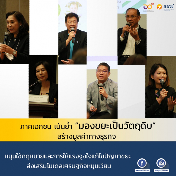 ส่วนผู้ร่วมเสวนาภาคเอกชนในภาพรวมได้ให้ความเห็นว่า ปัญหาขยะของไทยยังไม่มีเครื่องมือการแก้ไขอย่างเป็นรูปธรรม ทั้งที่การจัดการปัญหาขยะมีความเกี่ยวโยงกับระบบเศรษฐกิจโดยรวม ไม่ว่าเป็นธุรกิจขนาดเล็กหรือขนาดใหญ่ควรต้องเข้ามามีส่วนร่วมในการจัดการตลอดทั้งห่วงโซ่คุณค่า (Value Chain) เริ่มจากการมองว่าขยะเป็นวัตถุดิบ เป็นทรัพยากร ที่สามารถนำไปสร้างมูลค่าให้กับภาคธุรกิจได้ โดยหัวใจสำคัญคือโรงงานหรือผู้ประกอบการรีไซเคิลที่ต้องเข้ามามีบทบาทในการบริหารจัดการร่วมกับภาครัฐและภาคเอกชน ซึ่งในปัจจุบันภาคเอกชนหลายแห่งได้มีการขับเคลื่อนดำเนินการตามแนวทางเศรษฐกิจหมุนเวียน ผ่านการดำเนินงานโดยหลักการ 3Rs เพื่อช่วยในการจัดการปัญหาขยะบรรจุภัณฑ์ไปบ้างแล้ว และมีการกำหนดวิสัยทัศน์และเป้าหมายของแต่ละบริษัทไว้อย่างชัดเจน เช่น การใช้วัตถุดิบผลิตบรรจุภัณฑ์จาก Bio-Based, ออกแบบบรรจุภัณฑ์ให้สามารถรีไซเคิลได้ 100 % และลดการผลิตพลาสติกใหม่ 35% ภายในปี 2025, ลดใช้บรรจุภัณฑ์พลาสติกและทดแทนด้วยบรรจุภัณฑ์ที่สามารถรีไซเคิลหรือย่อยสลายได้ตามธรรมชาติ เป็นต้น อีกทั้งตัวแทนภาคเอกชนยังได้ตั้งข้อสังเกตว่าในประเทศไทยยังไม่มีกฎหมาย ข้อบังคับที่ชัดเจนในการแยกขยะ หรือการนำบรรจุภัณฑ์ไปรีไซเคิล จึงเห็นว่าควรมีการจัดตั้งองค์กรเฉพาะเพื่อจัดการบรรจุภัณฑ์แต่ละประเภทให้เป็นระบบ ซึ่งต้องเป็นองค์กรที่มีองค์ความรู้ในการจัดการบรรจุภัณฑ์เพื่อสร้างความเชื่อมั่นและความยั่งยืนในการดำเนินการ รวมถึงมีช่องทางในการสื่อสารผลการดำเนินงานให้สาธารณชนทั่วไปได้รับรู้