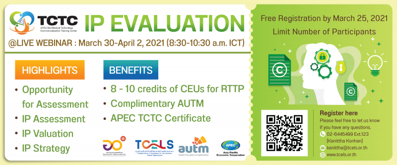 กระทรวงการอุดมศึกษาวิทยาศาสตร์ วิจัยและนวัตกรรม (อว.) โดย ศูนย์ความเป็นเลิศชีววิทยาศาสตร์ (องค์การมหาชน) หรือ ทีเซลส์ (TCELS) ฝ่ายยุทธศาสตร์อุตสาหกรรมและการลงทุน จับมือร่วมกับ Asia-Pacific Economic Cooperation (APEC) และ Association of University Technology Managers (AUTM) ร่วมจัดงานอบรม APEC Bio-Medical Technology Commercialization Training Center (APEC TCTC) หัวข้อ “IP Evaluation” โดยผ่านระบบออนไลน์ (Webinar) ในวันที่ 30-31 มีนาคม 2564 และ วันที่ 1-2 เมษายน 2564 เวลา 8.30-10.30 น.