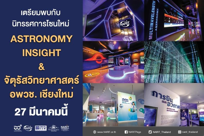 สถาบันวิจัยดาราศาสตร์แห่งชาติ (องค์การมหาชน) (สดร.) ร่วมกับ องค์การพิพิธภัณฑ์วิทยาศาสตร์แห่งชาติ (อพวช.) กระทรวงการอุดมศึกษา วิทยาศาสตร์ วิจัยและนวัตกรรม (อว.) แถลงข่าวเปิดตัวนิทรรศการชุดใหม่ “Astronomy Insight” และ “จัตุรัสวิทยาศาสตร์ อพวช. เชียงใหม่” ภายในอุทยานดาราศาสตร์สิรินธรอ.แม่ริม จ.เชียงใหม่ พร้อมให้บริการตั้งแต่ 27 มีนาคมนี้ และชวนเที่ยวงานมหกรรมดาราศาสตร์ประจำปี 2564 NARIT AstroFest 2021 จัดเต็มหลากหลายกิจกรรมดาราศาสตร์และวิทยาศาสตร์ที่น่าสนใจสำหรับทุกเพศทุกวัย ลุ้นรับกล้องโทรทรรศน์และรางวัลพิเศษมากมายภายในงาน พร้อมเตรียมมาตรการคัดกรองและเฝ้าระวังโควิด 19 เต็มรูปแบบ
