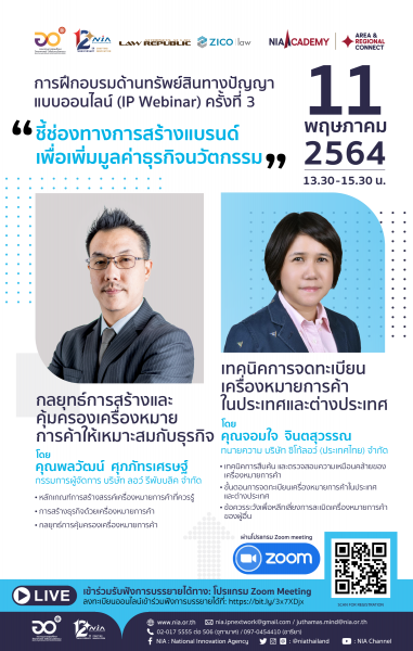 (ประกาศ)NIA ขอเรียนเชิญเข้าร่วมรับฟังการบรรยายด้านทรัพย์สินทางปัญญาแบบออนไลน์ (IP Webinar) ครั้งที่ 3 เรื่อง “ชี้ช่องทางการสร้างแบรนด์เพื่อเพิ่มมูลค่าธุรกิจนวัตกรรม”