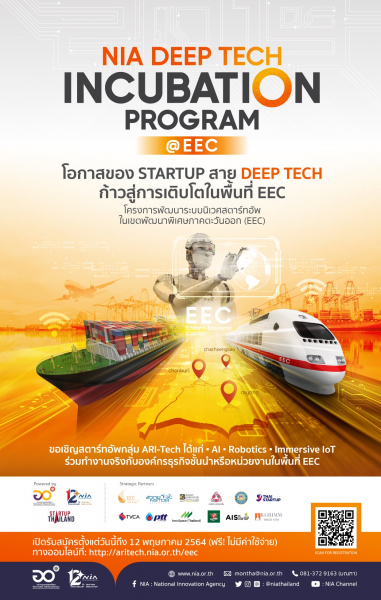 สำนักงานนวัตกรรมแห่งชาติ (องค์การมหาชน) หรือ NIA ร่วมกับองค์กรพันธมิตรเปิดตัว “โครงการพัฒนาระบบนิเวศวิสาหกิจเริ่มต้นในพื้นที่เขตพัฒนาพิเศษภาคตะวันออก (EEC) โดยมีกิจกรรมบ่มเพาะสตาร์ทอัพที่ใช้เทคโนโลยีเชิงลึก หรือ NIA Deep Tech Incubation Program@EEC เพื่อสร้างโอกาสให้สตาร์ทอัพสาย Deep tech ได้พัฒนาทักษะและศักยภาพ พร้อมเพิ่มขีดความสามารถในการพัฒนาผลิตภัณฑ์ ต่อยอดสู่การขยายธุรกิจในพื้นที่เขตพัฒนาพิเศษภาคตะวันออก ซึ่งเป็นพื้นที่ที่มีศักยภาพเอื้อต่อการทำงานร่วมกันกับองค์กรพันธมิตรในพื้นที่ในการสร้างสรรค์นวัตกรรรมและหาแนวทางการแก้ไขปัญหาใหม่ๆ เชื่อมโยงเครือข่ายเข้าร่วมเป็นดำเนินทั้งหน่วยงานภาครัฐและเอกชน (Public Private Partnership หรือ PPP) โดยมุ่งเน้นการประยุกต์ใช้เทคโนโลยีเชิงลึก ในกลุ่ม ARI-Tech ได้แก่ 1) Artificial Intelligent (AI) 2) Robotics 3) Immersive IoT ร่วมดำเนินงานกับ 12 กลุ่มอุตสาหกรรม เช่น เกษตร อาหาร การขนส่ง ที่จะนำเทคโนโลยีและนวัตกรรมตอบสนองความต้องการของพื้นที่ในหลากหลายอุตสาหกรรมเป้าหมายได้