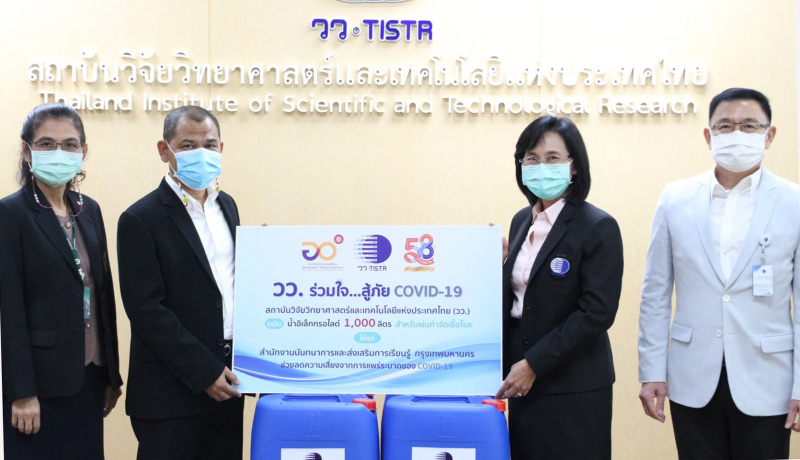 ศ.(วิจัย) ดร.ชุติมา เอี่ยมโชติชวลิต ผู้ว่าการสถาบันวิจัยวิทยาศาสตร์และเทคโนโลยีแห่งประเทศไทย (วว.) กระทรวงการอุดมศึกษา วิทยาศาสตร์ วิจัยและนวัตกรรม ส่งมอบน้ำอิเล็กทรอไลต์ 1,000 ลิตรสำหรับพ่นกำจัดเชื้อโรค ให้แก่ นายกรณิศ บัวจันทร์ ผู้อำนวยการสำนักงานนันทนาการและส่งเสริมการเรียนรู้ กรุงเทพมหานคร และคณะ สำหรับนำไปใช้ทำความสะอาดสถานที่และพื้นผิวสัมผัส ภายในหน่วยบริการของสังกัดฯ ได้แก่ ศูนย์เยาวชน/ศูนย์สร้างสุขทุกวัย ห้องสมุดเพื่อการเรียนรู้ และพิพิธภัณฑ์เด็กกรุงเทพมหานคร เพื่อสามารถให้บริการประชาชนได้อย่างต่อเนื่องและปลอดภัย อีกทั้งยังช่วยลดความเสี่ยงจากการแพร่ระบาดของไวรัสโควิด-19 ในวันที่ 21 มิถุนายน 2564 ณ ห้องประชุม กวท. วว.เทคโนธานี จังหวัดปทุมธานี