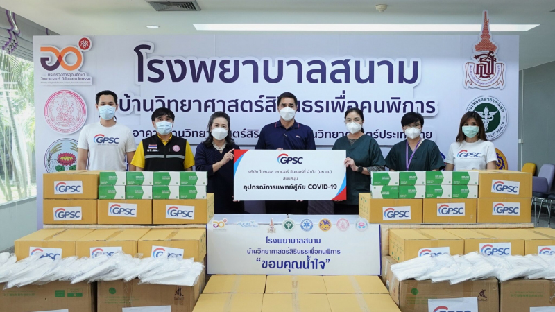 9 สิงหาคม 2564 ณ โรงพยาบาลสนามบ้านวิทยาศาสตร์สิรินธรเพื่อคนพิการ : คุณจารุวัฒน์ สิงห์สมดี ผู้จัดการฝ่ายอาวุโสบริหารการเปลี่ยนแปลงและความยั่งยืนองค์กร บริษัท โกลบอล เพาเวอร์ ซินเนอร์ยี่ จำกัด (มหาชน) (GPSC) มอบอุปกรณ์ทางการแพทย์ ประกอบด้วย ชุด PPE จำนวน 500 ชุด พร้อมหน้ากากอนามัยทางการแพทย์ จำนวน 50,000 ชิ้น เพื่อสนับสนุนการปฏิบัติงานของทีมบุคลากรทางการแพทย์ รวมถึงเจ้าหน้าที่ที่ปฏิบัติงานในโรงพยาบาลสนามฯ