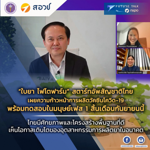 สำนักงานสภานโยบายการอุดมศึกษา วิทยาศาสตร์ วิจัยและนวัตกรรมแห่งชาติ (สอวช.) จัดรายการพูดคุยผ่านช่องทางออนไลน์ ถึงการเตรียมความพร้อมให้กับประเทศไทยรับมือกับเทรนด์การเปลี่ยนแปลงในอนาคต เพื่อมองหาและสร้างโอกาสให้กับประเทศผ่านการแลกเปลี่ยนมุมมองจากผู้เชี่ยวชาญและมีประสบการณ์ตรง ในรายการ Future Talk by NXPO ครั้งที่ 4 พูดคุยในประเด็น “ความก้าวหน้าการพัฒนาวัคซีนโควิด-19 ของบริษัทสตาร์ทอัพสัญชาติไทยด้วยกลไกการบ่มเพาะจากสถาบันอุดมศึกษา” ได้รับเกียรติจาก ผศ.ภญ.ดร.สุธีรา เตชคุณวุฒิ อาจารย์คณะเภสัชศาสตร์ จุฬาลงกรณ์มหาวิทยาลัย Co-founder และ CEO บริษัท ใบยา ไฟโตฟาร์ม จำกัด และ รศ.ดร.วรัญญู พูลเจริญ Co-founder และ Chief Technology Officer (CTO) บริษัท ใบยา ไฟโตฟาร์ม จำกัด มาร่วมพูดคุย ดำเนินรายการโดย ดร.กิติพงค์ พร้อมวงค์ ผู้อำนวยการ สอวช.