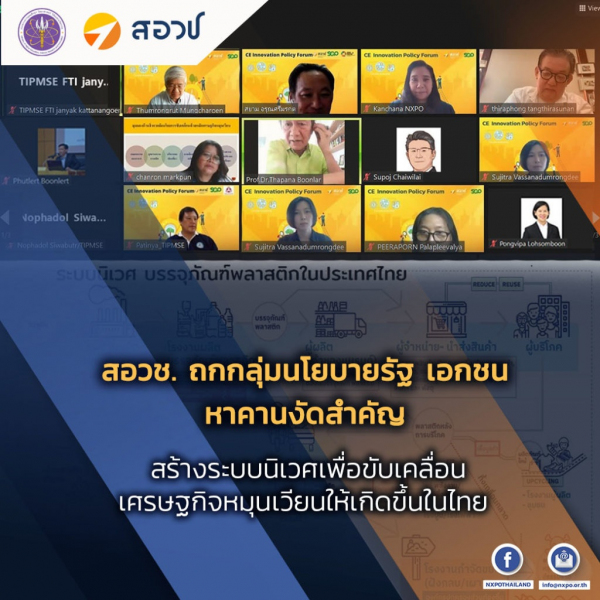 สำนักงานสภานโยบายการอุดมศึกษา วิทยาศาสตร์ วิจัยและนวัตกรรมแห่งชาติ (สอวช.) และสมาคมส่งเสริมการผลิตและการบริโภคที่ยั่งยืน (ประเทศไทย) หรือ Thai SCP Network จัดกิจกรรมสัมมนาผ่านระบบออนไลน์ ภายใต้โครงการบูรณาการและขับเคลื่อนภาคส่วนของไทยสู่ระบบเศรษฐกิจหมุนเวียน CE Innovation Policy Forum กลุ่มนโยบายและแผน หัวข้อ “เสนอแนะแนวทางในการขับเคลื่อนภาคส่วนของไทยสู่ระบบเศรษฐกิจหมุนเวียน และนโยบายในการสร้างนวัตกรรมเศรษฐกิจหมุนเวียน” เมื่อวันที่ 3 กันยายน 2564 ที่ผ่านมา มีวัตถุประสงค์เพื่อระดมความคิดเห็นความต้องการด้านการสนับสนุนเพื่อส่งเสริมให้เกิดเศรษฐกิจหมุนเวียน และร่วมหาแนวทางในการขับเคลื่อนภาคส่วนของไทยสู่ระบบเศรษฐกิจหมุนเวียน และนโยบายในการสร้างนวัตกรรมเศรษฐกิจหมุนเวียนหลังจากที่ได้ถกประเด็นสถานภาพปัจจุบันและอุปสรรคการดำเนินงานที่เกี่ยวข้องภายใต้แนวคิดเศรษฐกิจหมุนเวียนในการสัมมนาครั้งที่ 1 และ 2 เมื่อวันที่ 2 และ 16 สิงหาคม 2564 และมีผู้เข้าร่วมมากกว่า 120 ท่านที่ผ่านมา โดยได้รับเกียรติจาก ดร.กาญจนา วานิชกร รองผู้อำนวยการ สอวช. กล่าวต้อนรับ ซึ่งมีผู้สนใจเข้าร่วมการสัมมนาในครั้งนี้กว่า 50 คน