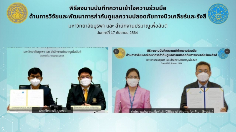 วันที่ 17 กันยายน 2564 สำนักงานปรมาณูเพื่อสันติ (ปส.) กระทรวงการอุดมศึกษา วิทยาศาสตร์ วิจัยและนวัตกรรม (อว.) ร่วมกับมหาวิทยาลัยบูรพา ลงนามบันทึกความเข้าใจความร่วมมือทางวิชาการ เพื่อพัฒนาศักยภาพด้านการกำกับดูแลความปลอดภัยทางนิวเคลียร์และรังสี ให้เกิดความปลอดภัยทางรังสี ต่อประชาชนและสิ่งแวดล้อมในพื้นที่ภาคตะวันออกของประเทศ