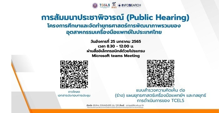 กระทรวงการอุดมศึกษา วิทยาศาสตร์ วิจัยและนวัตกรรม โดยศูนย์ความเป็นเลิศด้านชีววิทยาศาสตร์ (องค์การมหาชน) หรือ ทีเซลส์ (TCELS) ได้ดำเนินการจัดทำแผนยุทธศาสตร์ด้านเครื่องมือแพทย์ เพื่อนำเสนอยุทธศาสตร์ในการพัฒนาธุรกิจอุตสาหกรรมของประเทศ โดยได้ดำเนินการศึกษาและเสนอยุทธศาสตร์ให้มีความสอดคล้องกับแผนงานขับเคลื่อน BCG Model สาขาเครื่องมือแพทย์ และแผนด้านวิทยาศาสตร์ วิจัย และนวัตกรรมของประเทศ รวมถึงแผนระดับชาติที่เกี่ยวข้องกับพันธกิจของ ทีเซลส์ (TCELS) ทั้งสามด้าน คือ 1. เร่งรัดขับเคลื่อนงานวิจัยและนวัตกรรมด้านการแพทย์ช่วงปลายน้ำ (Accelerating Innovation) 2. สร้างระบบนิเวศที่เอื้ออำนวยต่อการผลักดันงานไปสู่การใช้ประโยชน์ (Building Conducive Ecosystem) และกระตุ้น 3. เชื่อมโยงเครือข่ายพันธมิตรให้เกิดธุรกิจและอุตสาหกรรม (Catalyzing & Connecting Partners to Global Linkage) โดยได้สร้างการมีส่วนร่วมในการจัดทำยุทธศาสตร์ระหว่างภาคส่วนต่างๆ และได้จัดสัมมนาประชาพิจารณ์ (Public Hearing) “โครงการศึกษาและจัดทำยุทธศาสตร์การพัฒนาภาพรวมของอุตสาหกรรมเครื่องมือแพทย์ในประเทศไทย” เมื่อวันอังคารที่ 25 มกราคม 2565 ผ่านระบบออนไลน์ โปรแกรม Microsoft Teams Meeting เพื่อรวบรวมความคิดเห็นของผู้มีส่วนได้ส่วนเสียที่เกี่ยวข้องทั้งหมดในการพัฒนายุทธศาสตร์เครื่องมือแพทย์ไทย และนำไปปรับร่างแผนยุทธศาสตร์ฯ ให้มีความเหมาะสมต่อไปในอนาคต