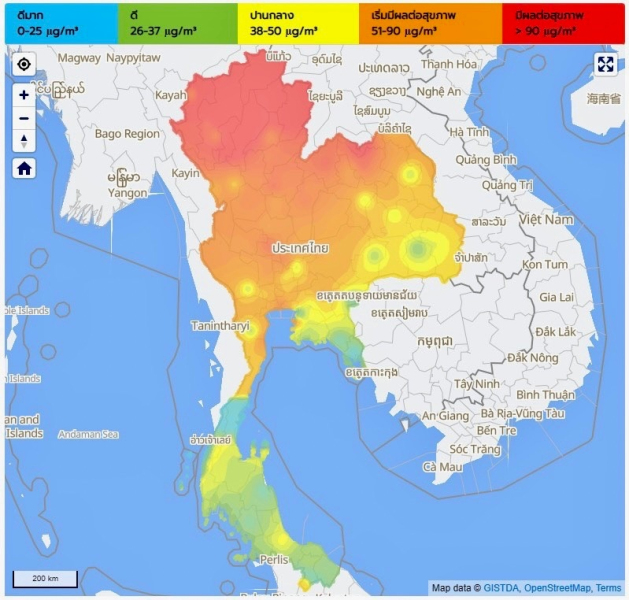 GISTDA เผยข้อมูลจากแอปพลิเคชัน “เช็คฝุ่น” เมื่อเวลา 14.00 น. พบค่าฝุ่น PM2.5 เกินมาตรฐานทั่วประเทศเกือบ 40 จังหวัด และภาคเหนือยังเป็นพื้นที่ที่พบค่าฝุ่นพิษหนักที่สุดอยู่ในระดับสีแดงที่มีผลกระทบต่อสุขภาพ โดยเฉพาะที่อำเภอแม่สาย จังหวัดเชียงรายพุ่งไปถึง 147 ไมโครกรัม รวมถึงอีก 17 อำเภอที่เกินค่ามาตรฐาน ในขณะที่เชียงใหม่พบฝุ่น PM2.5 อยู่ที่ 110 ไมโครกรัม, ลำปาง 105 ไมโครกรัม, น่าน 104 ไมโครกรัม, พะเยาและแม่ฮ่องสอน 100 ไมโครกรัมเท่ากัน ส่วน กทม. ค่าคุณภาพโดยรวมเกินมาตรฐานในระดับสีส้มที่เริ่มจะมีผลกระทบต่อสุขภาพ