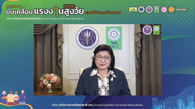 ดร.วิภารัตน์ ดีอ่อง ผู้อำนวยการสำนักงานการวิจัยแห่งชาติ กล่าวว่า จากสถานการณ์ปัจจุบัน ประเทศไทยเข้าสู่สังคมสูงวัยอย่างสมบูรณ์ เกิดการเปลี่ยนแปลงโครงสร้างประชากร ทำให้จำนวนและสัดส่วนของผู้สูงอายุเพิ่มขึ้นอย่างรวดเร็ว วช. ในฐานะหน่วยงานหลักในการสนับสนุนทุนวิจัยและนวัตกรรมด้านการเตรียมรับสังคมสูงวัย ได้ให้การสนับสนุนงานวิจัยมาอย่างต่อเนื่อง เพื่อสร้างความตระหนักและการเตรียมความพร้อมรับกับสถานการณ์ดังกล่าว จึงได้จัดเสวนา “ขับเคลื่อนแรงงานสูงวัย ด้วยวิจัยและนวัตกรรม” ในรูปแบบ Online ผ่านระบบ Zoom Meeting และ Facebook live เพื่อเป็นเวทีแลกเปลี่ยนความรู้และเผยแพร่ผลงานวิจัยและนวัตกรรม ในการเตรียมความพร้อมทางด้านการเงิน การลงทุน และสนับสนุนการทำงานหรือการมีงานทำของผู้สูงอายุ เพื่อสร้างรายได้รวมถึงช่วยยกระดับคุณภาพชีวิตของผู้สูงวัย