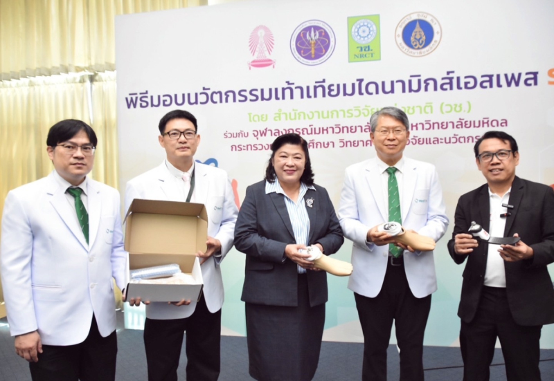 โดย วช. ได้มอบนวัตกรรมเท้าเทียมไดนามิก “sPace” ทั่วประเทศ จำนวน 200 ชุด โดยมอบให้โรงพยาบาลในกรุงเทพ 5 โรงพยาบาล และโรงพยาบาลในต่างจังหวัดได้แก่ ภาคใต้ 7 จังหวัด ภาคเหนือ 2 จังหวัด ภาคอีสาน 3 จังหวัด รวมทั้งสิ้น 17 โรงพยาบาล ซึ่งเท้าเทียมไดนามิกส์เอสเพส ผลิตโดยบริษัท มุทา จำกัด ซึ่งเป็นบริษัทที่ได้รับการถ่ายทอดเทคโนโลยีจากจุฬาลงกรณ์มหาวิทยาลัย และได้ขึ้นทะเบียนสถานประกอบการผลิตและจดแจ้งผลิตภัณฑ์เท้าเทียมไดนามิกกับ อย.