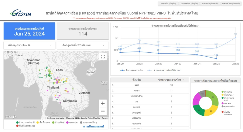 ทั้งนี้ จากข้อมูลจุดความร้อนที่รายงานโดย GISTDA เมื่อวันที่ 25 มกราคม 2567 พบจุดความร้อนทั้งประเทศ 114 จุด ส่วนใหญ่พบในพื้นที่ป่าอนุรักษ์ 33 จุด พื้นที่เกษตร 26 จุด พื้นที่ป่าสงวนแห่งชาติ 23 จุด พื้นที่เขต สปก. 21 จุด ชุมชนและอื่นๆ 10 จุด และพื้นที่ริมทางหลวง 1 จุด โดยจังหวัดที่พบจำนวนจุดความร้อนสูงสุด 3 อันดับแรก #แพร่ 13 จุด #พะเยา 11 จุด #หนองบัวลำภู 9 จุด