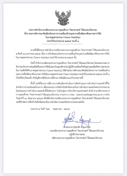 สำนักงานปลัดกระทรวงการอุดมศึกษา วิทยาศาสตร์ วิจัยและนวัตกรรม โดยคณะกรรมการพิจารณาโครงการส่งเสริมให้บุคลากรวิจัยในสถาบันอุดมศึกษาไปปฏิบัติงานเพื่อแก้ไขปัญหาและเพิ่มขีดความสามารถในการผลิตให้กับภาคอุตสาหกรรม (Talent Mobility) ได้ดำเนินการพิจารณาคัดเลือกโครงการการเคลื่อนย้ายบุคลากรเพื่อพัฒนาศักยภาพการวิจัยในภาคอุตสาหกรรม (Talent Mobility) ประจำปีงบประมาณ 2565 รอบที่ 1 เป็นที่เรียบร้อยแล้ว ดังบัญชีรายชื่อโครงการที่ผ่านการคัดเลือกแนบท้ายประกาศนี้