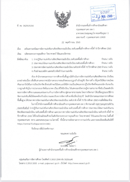 3. ประกาศการจัดการแซ่งขันงนศิสปหัตกรมนักเรียน ระดับชาติ ครั้งที่ 70 ปีการศึกษา 2565 จำนวน 1 ฉบับ