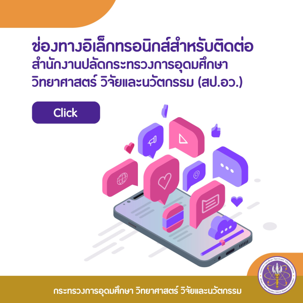 ช่องทางอิเล็กทรอนิกส์สำหรับติดต่อสำนักงานปลัดกระทรวงการอุดมศึกษา วิทยาศาสตร์ วิจัยและนวัตกรรม พ.ศ. 2566 เพื่อเป็นช่องทางในการอำนวยความสะดวกและลดภาระแก่ประชาชน รวมทั้งเพิ่มประสิทธิภาพในการปฏิบัติราชการ