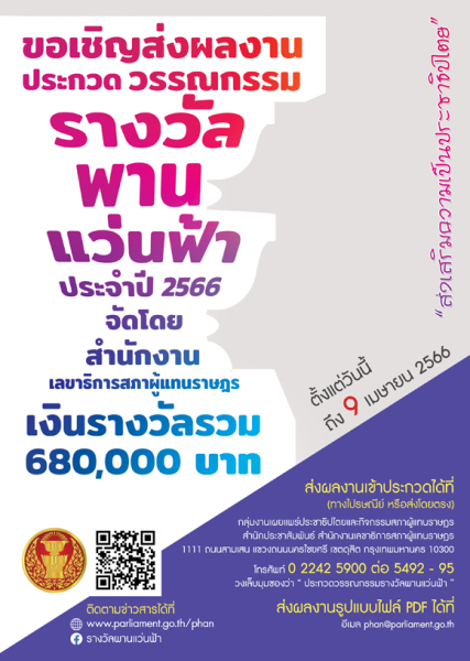 โดยผู้สนใจสามารถส่งผลงานเข้าประกวดได้ตั้งแต่บัดนี้จนถึงวันที่ 9 เมษายน 2566 ทางอีเมล phan@parliament.go.th สอบถามรายละเอียดเพิ่มเติมได้ที่เบอร์ 02-242-5900 ต่อ 5492 - 95 ติดตามข่าวสารได้ที่ https://www.parliament.go.th/phan และ https://www.facebook.com/phan.waenfah/