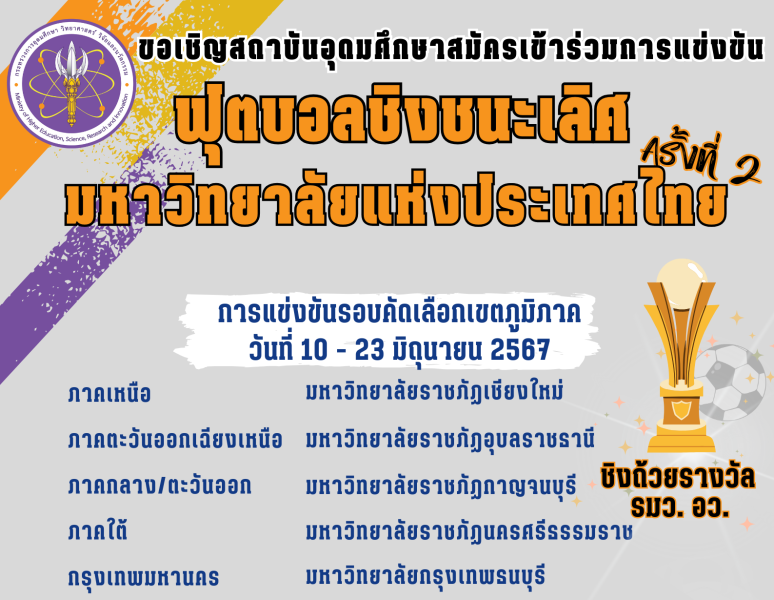 หรือ QR Code ที่จัดส่งให้ ภายในวันที่ 29 เมษายน 2567 เวลา 23.59 น. หากพ้นกำหนดดังกล่าวจะถือว่าสถาบันอุดมศึกษาของท่านสละสิทธิ์การเข้าร่วมการแข่งขันกีฬาฟุตบอลชิงชนะเลิศมหาวิทยาลัยแห่งประเทศไทย ครั้งที่ 2 ศึกษาข้อมูลเพิ่มเติมสามารถแสกน QR Code 1 เอกสารเกี่ยวข้องกับการแข่งขันฯ หรือ โทร 02-039-5601,5580
