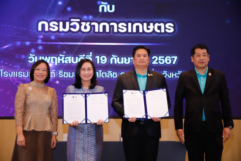 ดร.ชุติมา เอี่ยมโชติชวลิต ผู้ว่าการ สถาบันวิจัยวิทยาศาสตร์และเทคโนโลยีแห่งประเทศไทย (วว.) กระทรวงการอุดมศึกษา วิทยาศาสตร์ วิจัยและนวัตกรรม (อว.) และนายรพีภัทร์ จันทรศรีวงศ์ อธิบดีกรมวิชาการเกษตร ร่วมลงนามบันทึกข้อตกลงความร่วมมือทางวิชาการ ด้านการวิจัยและพัฒนา การขยายผลการใช้ประโยชน์และสร้างเครือข่ายทั้งนักวิจัยด้านการเกษตรและผู้ประกอบการสู่การใช้ประโยชน์จริง รวมทั้งเผยแพร่องค์ความรู้การพัฒนางานวิจัย เทคโนโลยีและนวัตกรรมด้านการเกษตร การบริหารจัดการผลผลิตทางการเกษตร ให้สามารถเข้าสู่การรับรองมาตรฐานสินค้าเกษตรในระดับสากล โอกาสนี้ ดร.โศรดา วัลภา รองผู้ว่าการวิจัยและพัฒนาด้านอุตสาหกรรมชีวภาพ และนายพงศ์ไท ไทโยธิน รองอธิบดีกรมวิชาการเกษตร ร่วมเป็นสักขีพยาน โดยมีคณะผู้บริหารและบุคลากรทั้งสองหน่วยงานร่วมเป็นเกียรติและแสดงความยินดีด้วย ในวันที่ 19 กันยายน 2567 ณ โรงแรมแกรนด์ริชมอนด์ จังหวัดนนทบุรี