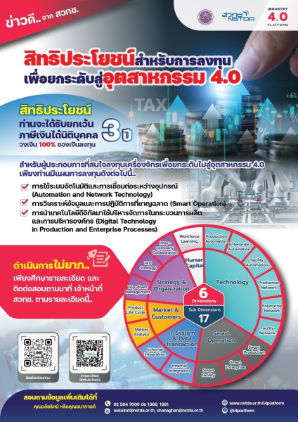 สำนักงานพัฒนาวิทยาศาสตร์และเทคโนโลยีแห่งชาติ (สวทช.) โดยกลุ่มแพลตฟอร์มสนับสนุนอุตสาหกรรม 4.0 (Thailand i4.0 Platform) ขอเชิญผู้ประกอบการในทุกกลุ่มอุตสาหกรรม ที่สนใจหรือมีการลงทุนในเครื่องจักร ได้แก่ การใช้ระบบอัตโนมัติและการเชื่อมต่อระหว่างอุปกรณ์ (Automation and Network Technology) การวิเคราะห์ข้อมูลและการปฏิบัติการที่ชาญฉลาด (Smart Operation) และการนำเทคโนโลยีดิจิทัลมาใช้บริหารจัดการในกระบวนการผลิตและการบริหารองค์กร (Digital Technology in Production and Enterprise Processes) เข้าร่วมรับสิทธิประโยชน์ยกเว้นภาษีเงินได้นิติบุคคล 3 ปี ภายใต้วงเงิน 100% ของเงินลงทุน ตามนโยบายของ BOI เพื่อส่งเสริมการลงทุนและยกระดับอุตสาหกรรมไทยสู่ Industry 4.0