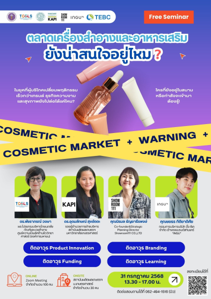บริษัท เค-เอพีไอ จำกัด (K-API)  ร่วมกับ สถาบันผลิตผลทางการเกษตรและอุตสาหกรรมเกษตร มหาวิทยาลัยเกษตรศาสตร์ จัดงานสัมมนา “ตลาดเครื่องสำอางและอาหารเสริมยังน่าสนใจอยู่ไหม?” ในวันพฤหัสบดีที่ 31 ก.ค. 2568 เวลา 13.30 – 17.00 น. ขอเชิญชวนผู้ประกอบการ SME, ผู้ประกอบการเครื่องสำอางและอาหารเสริม, เจ้าของแบรนด์เครื่องสำอางและอาหารเสริม, นักการตลาดเครื่องสำอางและอาหารเสริม หรือ ผู้ที่สนใจธุรกิจความงามและสุขภาพ ลงทะเบียนเข้าร่วมฟังงานสัมมนาได้ฟรี (ไม่มีค่าใช้จ่าย) ณ สถาบันผลิตผลทางการเกษตรและอุตสาหกรรมเกษตร มหาวิทยาลัยเกษตรศาสตร์ บางเขน เปิดรับจำนวน 30 ท่าน และเข้าร่วมรับฟังสัมมนาทางออนไลน์ได้ที่ Zoom Meeting เปิดรับจำนวน 100 คน