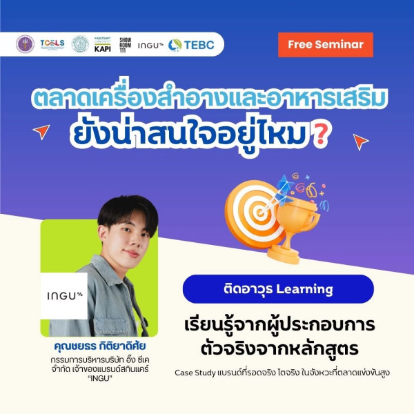 ในยุคที่ผู้บริโภคเปลี่ยนพฤติกรรมเร็วกว่าเทรนด์ ทิศทางอุตสาหกรรมเครื่องสำอางในประเทศไทยมีมูลค่าทางการตลาดที่ใหญ่ และเติบโตอย่างต่อเนื่อง ได้เวลามาร่วมเจาะลึกกลยุทธ์ตลาดเครื่องสำอางและอาหารเสริม ที่มีการแข่งขันกันสูง พร้อมติดอาวุธ เทคนิคการสร้างแบรนด์และการตลาดให้โดนใจผู้บริโภค ทำการตลาดอย่างไรให้เติบโตอย่างยั่งยืน และได้ยอดปัง พบกับวิทยากร กูรูกลยุทธ์ด้านการตลาด ที่จะมาเผยอาวุธลับ ถอดรหัสธุรกิจตลาดเครื่องสำอางและอาหารเสริม