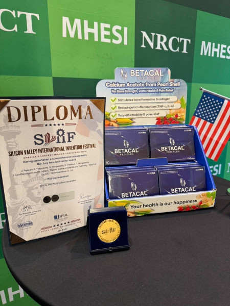 3.สารสกัดไข่มุก เพื่อเสริมสร้างกระดูก : ผลิตภัณฑ์เสริมอาหาร ตราเบต้าออยด์ (BTACAL PRO PLUS for Bone rejuvenation) ได้รับรางวัลเหรียญทอง และ special award จาก สมาพันธ์ Taiwan Invention Association