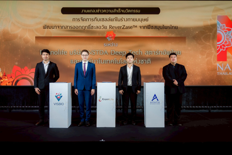 บริษัท โครโนไลฟ์ จำกัด ดีปเทคสตาร์ทอัพภายใต้ ศูนย์นาโนเทคโนโลยีแห่งชาติ (นาโนเทค) สำนักงานพัฒนาวิทยาศาสตร์และเทคโนโลยีแห่งชาติ (สวทช.) จัดแถลงข่าวพิธีลงนามความร่วมมือกับบริษัท เอวาย่า อินเตอร์เนชั่นนอล จำกัด และ บริษัท วิสไบโอ จำกัด ภายใต้แนวคิด “From DeepTech to Longevity Innovation” เพื่อสะท้อนถึงความสำเร็จของการถ่ายทอดเทคโนโลยีจากภาครัฐ โดยนักวิจัยจากศูนย์นาโนเทค สู่บริษัท โครโนไลฟ์ สตาร์ทอัพที่ต่อยอดองค์ความรู้ด้านสมุนไพรไทยไปสู่การพัฒนาสารออกฤทธิ์ และนวัตกรรมผลิตภัณฑ์เพื่อการชะลอวัยและสุขภาพยืนยาว พร้อมทั้งเปิดตัวผลิตภัณฑ์จากงานวิจัยที่ได้รับการต่อยอดเชิงพาณิชย์ ภายใต้แบรนด์ร่วม THÉVASE (เทวาเซ่)