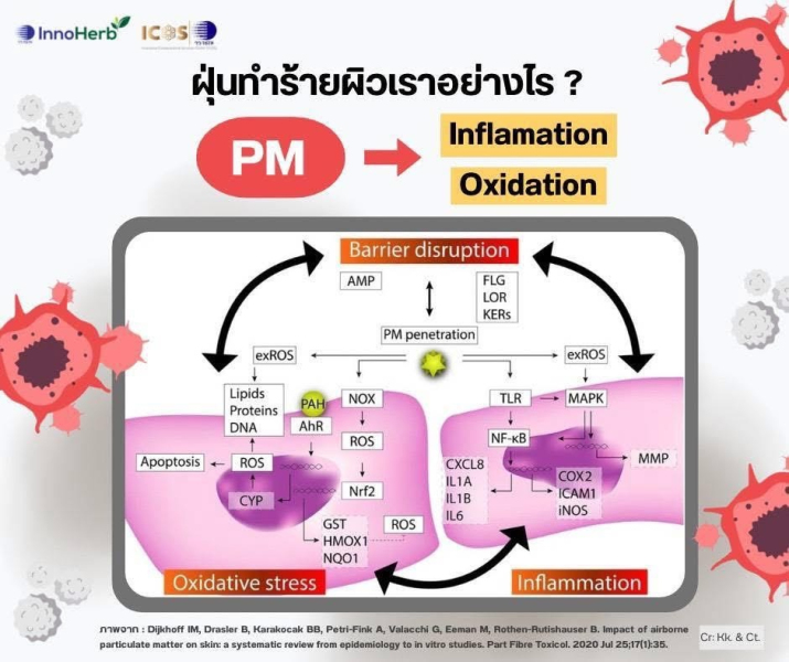 ฝุ่น PM แบ่งออกเป็น 2 ขนาด คือ 1) PM 10 มีเส้นผ่านศูนย์กลางประมาณ 10 ไมครอน หรือเล็กกว่า และ PM 2.5 อนุภาคละเอียดที่มีขนาดเส้นผ่านศูนย์กลางประมาณ 2.5 ไมครอน หรือเล็กกว่า โดย PM สามารถทะลุผ่านชั้นผิวหนังและกระตุ้นกลไกทำลายเซลล์หลัก 2 ประการ ซึ่งจะนำไปสู่ปัญหาผิวเรื้อรัง ได้แก่ 1.ภาวะเครียดออกซิเดชัน (Oxidative Stress) ส่งผลให้การสร้างอนุมูลอิสระ (ROS) เกินขนาด ทำลาย DNA โปรตีน และไขมันในเซลล์ ซึ่งเป็นสาเหตุของการแก่ก่อนวัย และ 2.การอักเสบ (Inflammation) ที่กระตุ้นวิถีสัญญาณก่อให้เกิดการอักเสบ นำไปสู่ปัญหาผิวหนังอักเสบ สิว และหนังศีรษะอักเสบ