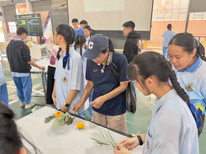 5) เรียนรู้เรื่องชนิดของใบไม้และดอกไม้ให้สี ปฏิบัติการพิมพ์ผ้าดอกไม้ให้สี (Eco Printing) โดย ผศ.ดร.โยธิน กัลยาเลิศ มหาวิทยาลัยราชภัฏวไลยอลงกรณ์ ในพระบรมราชูปถัมภ์ ดร.นิตยา แก้วแพรก นักวิจัยอาวุโส และนางปณิตา ทวีถาวร นักวิจัย ศูนย์เชี่ยวชาญนวัตกรรมวัสดุ วว.