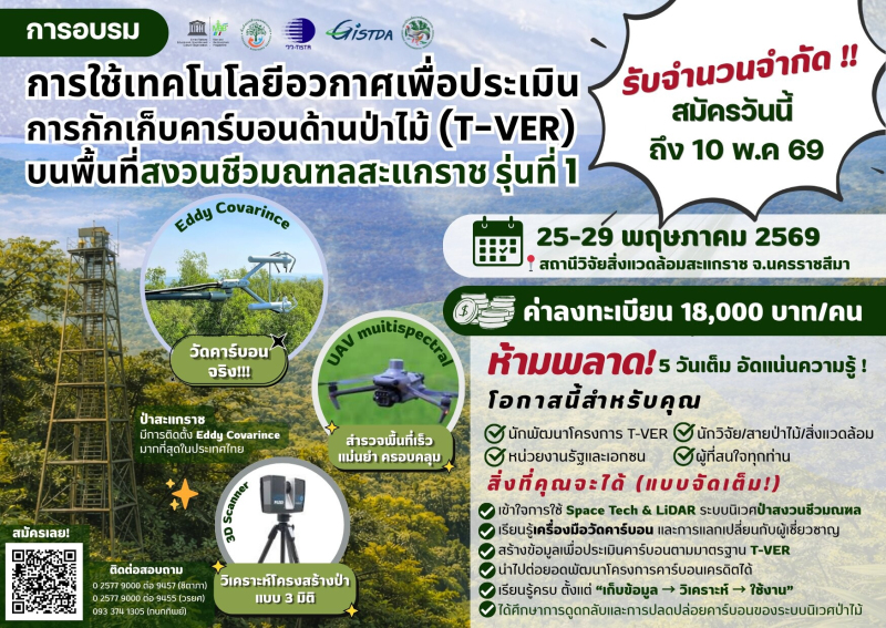 วว. โดย สถานีวิจัยสิ่งแวดล้อมสะแกราช เปิดรับสมัคร อบรมสุดเข้มข้น ด้าน “เทคโนโลยีอวกาศเพื่อประเมินการกักเก็บคาร์บอนในป่าไม้ (T-VER)” รุ่นที่ 1