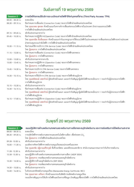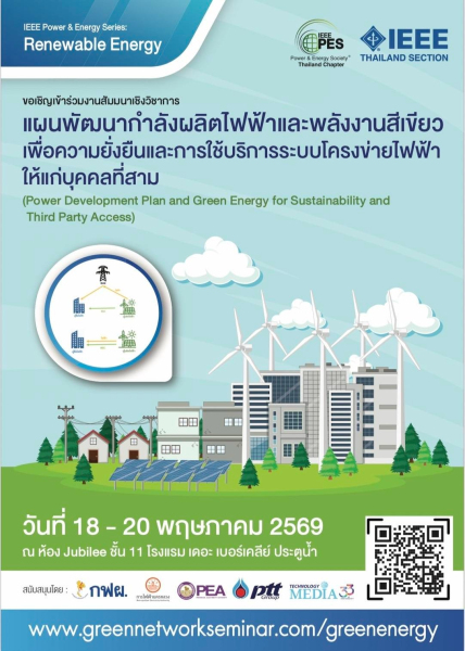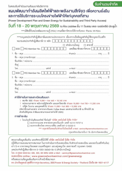 สำหรับหลักสูตรงานสัมมนาเชิงวิชาการเรื่อง "แผนพัฒนากำลังผลิตไฟฟ้าและพลังงานสีเขียวเพื่อความยั่งยืนและการใช้บริการระบบโครงข่ายไฟฟ้าให้แก่บุคคลที่สาม" ในวันที่ 18 - 20 พฤษภาคม 2569 เวลา 08.30 – 16.30 น. ณ โรงแรมเดอะ เบอร์เคลีย์ ประตูน้ำ