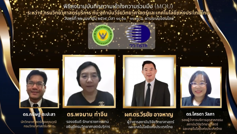วันที่ 22 เมษายน 2569 กรมวิทยาศาสตร์บริการ (วศ.) กระทรวงการอุดมศึกษา วิทยาศาสตร์ วิจัยและนวัตกรรม (อว.) จัดพิธีลงนามบันทึกความเข้าใจ (MOU) ร่วมกับ สถาบันวิจัยวิทยาศาสตร์และเทคโนโลยีแห่งประเทศไทย (วว.) โดยมี ดร.พจมาน ท่าจีน รองอธิบดี รักษาราชการแทน อธิบดีกรมวิทยาศาสตร์บริการ และ ดร.โศรดา วัลภา รองผู้ว่าการบริการอุตสาหกรรม ผู้แทน ผู้ว่าการสถาบันวิจัยวิทยาศาสตร์และเทคโนโลยีแห่งประเทศไทย ร่วมลงนาม พร้อมด้วยคณะผู้บริหาร บุคลากรจากทั้งสองฝ่ายร่วมเป็นสักขีพยาน ผ่านระบบออนไลน์ (Zoom) วัตถุประสงค์เพื่อยกระดับการให้บริการทดสอบและสอบเทียบของประเทศให้มีคุณภาพและได้มาตรฐานสากล