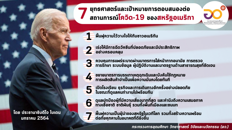 (22 มกราคม 2564) ศาสตราจารย์ ดร.นายแพทย์สิริฤกษ์ ทรงศิวิไล ปลัดกระทรวงการอุดมศึกษา วิทยาศาสตร์ วิจัยและนวัตกรรม (อว.) เปิดเผยว่า เมื่อประธานาธิบดีโจ ไบเดน เข้ารับตำแหน่งประธานาธิบดีสหรัฐอเมริกา ได้มอบนโยบายและมาตรการของประเทศเกี่ยวกับโรคโควิด-19 เป็นเอกสารละเอียดถึง 200 หน้า ครอบคลุมนโยบายและทิศทางที่ชัดเจน ซึ่งมีเนื้อหาแตกต่างจากนโยบายของอดีตประธานาธิบดีทรัมป์ค่อนข้างมาก รวมทั้งได้มีคำสั่งและบันทึกการสั่งการดำเนินงานทันทีกว่า 12 ฉบับ