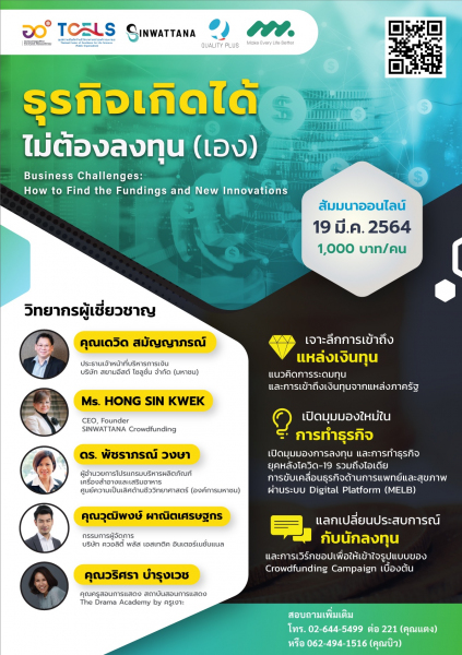 กระทรวงการอุดมศึกษา วิทยาศาสตร์ วิจัยและนวัตกรรม โดย ศูนย์ความเป็นเลิศด้านชีววิทยาศาสตร์ (องค์การมหาชน) หรือ ทีเซลส์ (TCELS) ฝ่ายโปรแกรมบริหารผลิตภัณฑ์เครื่องสำอางและเสริมอาหาร ร่วมกับ บริษัท ควอลิตี้ พลัส เอสเทติค อินเตอร์เนชั่นแนล จำกัด และ บริษัท ฟีนิกซิคท์ จำกัด (สินวัฒนา) จัดสัมมนาออนไลน์ "ธุรกิจเกิดได้ ไม่ต้องลงทุน (เอง)" Business Challenges: How to Find the Fundings and New Innovations ในวันศุกร์ที่ 19 มีนาคม พ.ศ. 2564 เวลา 13.00-16.30 น. พบกับวิทยากรผู้เชี่ยวชาญที่จะมาเจาะลึกการเข้าถึงแหล่งเงินทุน แนวคิดการระดมทุน และการเข้าถึงเงินทุนจากแหล่งภาครัฐ เปิดมุมมองใหม่ในการทำธุรกิจ ยุคหลังโควิด-19 รวมถึงไอเดียการขับเคลื่อนธุรกิจด้านการแพทย์และสุขภาพผ่านระบบ Digital Platform (MELB) พร้อมทั้งแลกเปลี่ยนประสบการณ์กับนักลงทุน และการเวิร์กชอปเพื่อให้เข้าใจรูปแบบของ Crowdfunding Campaign เบื้องต้น
