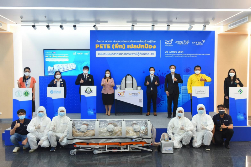 (29 เมษายน 2564) ที่โถงชั้น1 อาคารสำนักงาน สวทช. (โยธี) ถนนพระรามที่ 6 กทม. : กระทรวงการอุดมศึกษา วิทยาศาสตร์ วิจัยและนวัตกรรม (อว.) โดยศูนย์เทคโนโลยีโลหะและวัสดุแห่งชาติ (เอ็มเทค) สำนักงานพัฒนาวิทยาศาสตร์และเทคโนโลยีแห่งชาติ (สวทช.) นำโดยนางกุลประภา นาวานุเคราะห์ ผู้ช่วยผู้อำนวยการ สวทช. พร้อมด้วย ดร.ศราวุธ เลิศพลังสันติ หัวหน้าทีมวิจัยการออกแบบและแก้ปัญหาอุตสาหกรรม และทีมวิจัยเอ็มเทค สวทช. ได้ส่งมอบ PETE (พีท) เปลปกป้อง : เปลความดันลบเคลื่อนย้ายผู้ป่วย รวมจำนวน 5 ชุด ให้แก่โรงพยาบาลและหน่วยงานที่ทำหน้าที่ส่งต่อผู้ป่วยโรคโควิด-19 เพื่อสนับสนุนการปฏิบัติงานของบุคลากรทางการแพทย์ต่อสถานการณ์การระบาดโรคโควิด-19 ระลอกใหม่