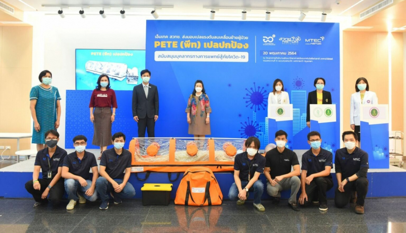 นำโดย ดร.จุลเทพ ขจรไชยกูล ผู้อำนวยการเอ็มเทค สวทช.  นางกุลประภา นาวานุเคราะห์ ผู้ช่วยผู้อำนวยการ สวทช. พร้อมด้วยทีมวิจัยเอ็มเทค ได้แก่ ดร.ศราวุธ เลิศพลังสันติ และ ดร.ก่อเกียรติ เศษชัยชาญ ร่วมกันส่งมอบ PETE (พีท) เปลปกป้อง: เปลความดันลบเคลื่อนย้ายผู้ป่วยโควิด-19 จำนวน 3 ชุด และรถส่งของบังคับทางไกล “อารี” เพื่อบุคลากรทางการแพทย์ สำหรับใช้ขนส่งสัมภาระให้ผู้ป่วยโควิด-19 จำนวน 1 ชุด ให้แก่โรงพยาบาลและโรงพยาบาลสนาม สนับสนุนการปฏิบัติงานของบุคลากรทางการแพทย์เพื่อรับมือสถานการณ์การระบาดโรคโควิด-19