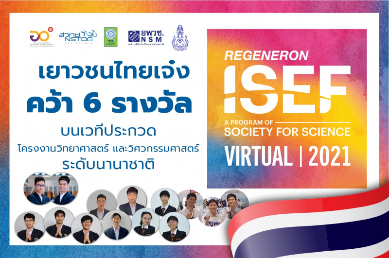 22 พฤษภาคม 2564 : กระทรวงการอุดมศึกษา วิทยาศาสตร์ วิจัยและนวัตกรรม (อว.) โดย สำนักงานพัฒนาวิทยาศาสตร์และเทคโนโลยีแห่งชาติ (สวทช.) สำนักงานการวิจัยแห่งชาติ (วช.) องค์การพิพิธภัณฑ์วิทยาศาสตร์แห่งชาติ (อพวช.) และสมาคมวิทยาศาสตร์แห่งประเทศไทยในพระบรมราชูปถัมภ์ ร่วมแสดงความยินดีกับทีมเยาวชนไทยคว้า 6 รางวัลจากการประกวดโครงงานวิทยาศาสตร์และวิศวกรรมระดับโลก Virtual Regeneron International Science and Engineering Fair (Regeneron ISEF 2021) ที่จัดขึ้นระหว่างวันที่ 16-21 พฤษภาคม 2564 โดยมีนักวิทยาศาสตร์รุ่นเยาว์กว่า 1,834 คน จาก 64 ประเทศ รวมถึง 49 มลรัฐในประเทศสหรัฐอเมริกา