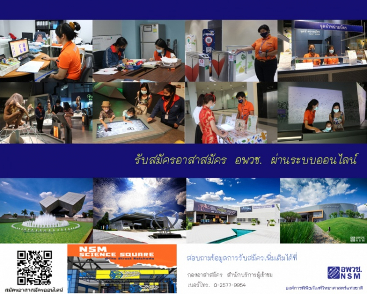 อพวช. เปิดรับสมัคร "อาสาสมัคร" แบบออนไลน์ มาปฏิบัติงาน ณ อพวช. คลองห้า ปทุมธานี และจัตุรัสวิทยาศาสตร์ อพวช. เดอะ สตรีท รัชดา หากท่านมีใจรักและเห็นความสำคัญของวิทยาศาสตร์ สนใจการสร้างสรรค์กิจกรรมสื่อสารวิทยาศาสตร์ หรือ งานฝ่ายสนับสนุนด้านต่าง ๆ เพื่อช่วยผลักดันภารกิจของ อพวช. ให้บรรลุเป้าหมาย อพวช.ขอเชิญชวนผู้สนใจ และผู้มีประสบการณ์ในงานที่เกี่ยวข้อง ตั้งแต่ระดับมัธยมศึกษา จนถึง ปริญญาตรี เข้ามาแลกเปลี่ยนเรียนรู้ระหว่างกัน เพื่อช่วยเสริมสร้างความรู้ความเข้าใจทางด้านวิทยาศาสตร์และเทคโนโลยีอย่างมุ่งมั่นและเข้มแข็ง มาร่วมทำงานกับทีมงานคุณภาพของ อพวช. เรารอทุกท่านอยู่